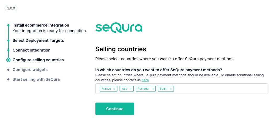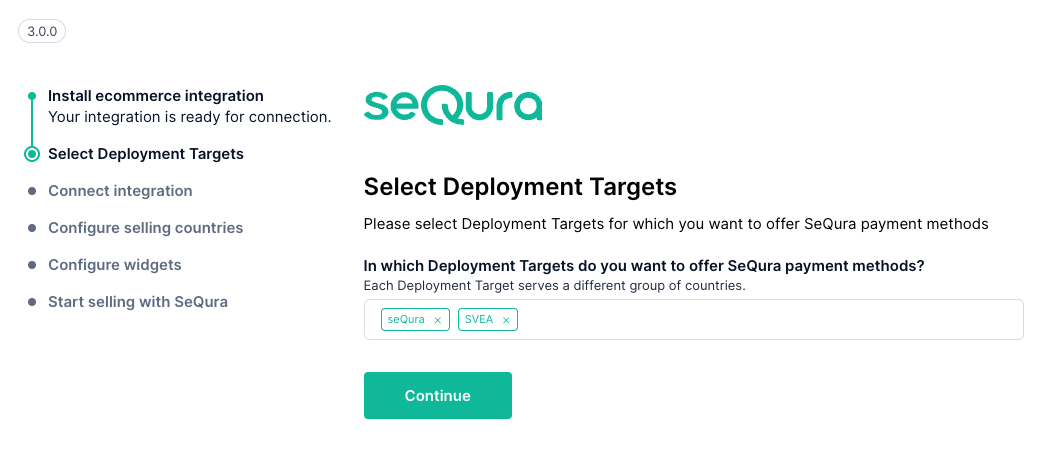 - Select the deployment target where you want to enable seQura. Choose seQura for Spain and SVEA for all other countries. If you offer seQura both in Spain and internationally, make sure to include both options.