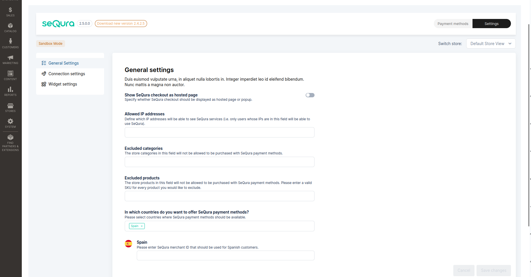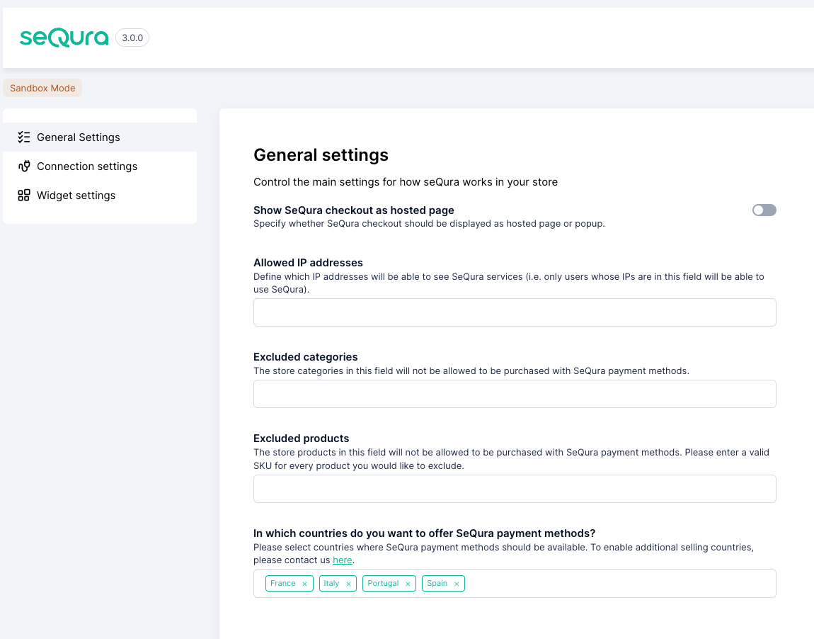 - Countries: Select the countries where seQura payment methods should be available. For each available country, add the ID provided by seQura for that country.