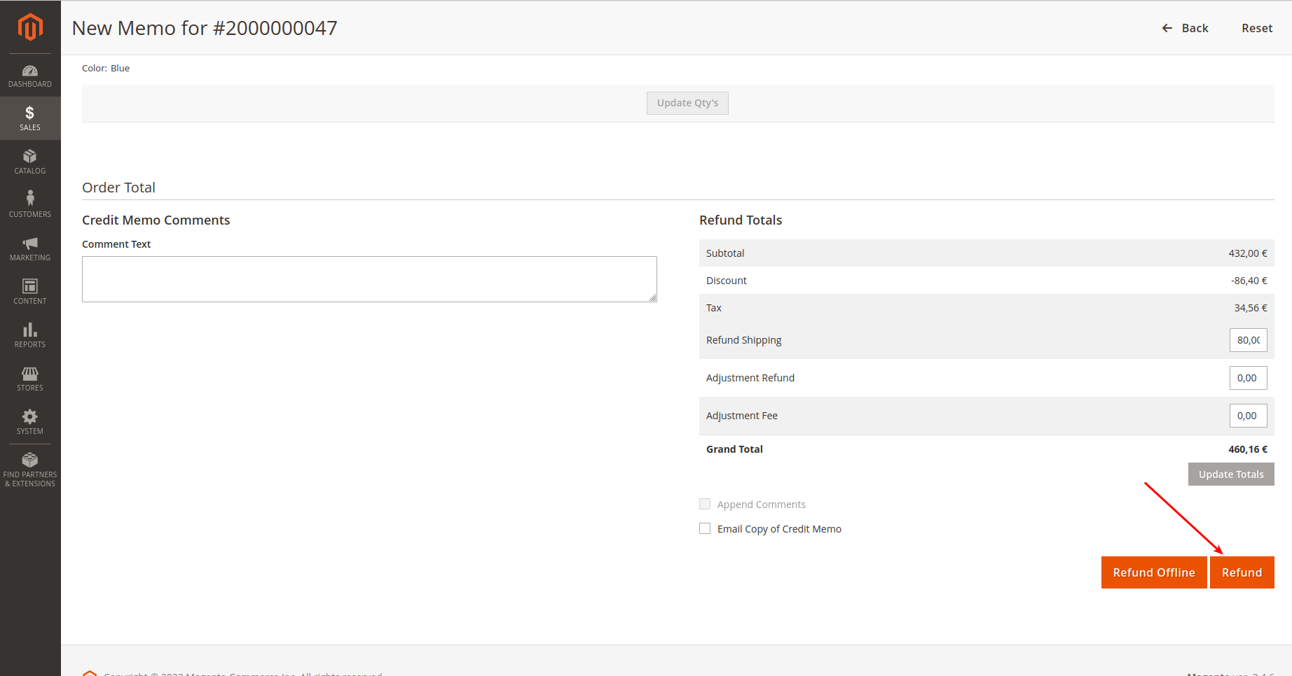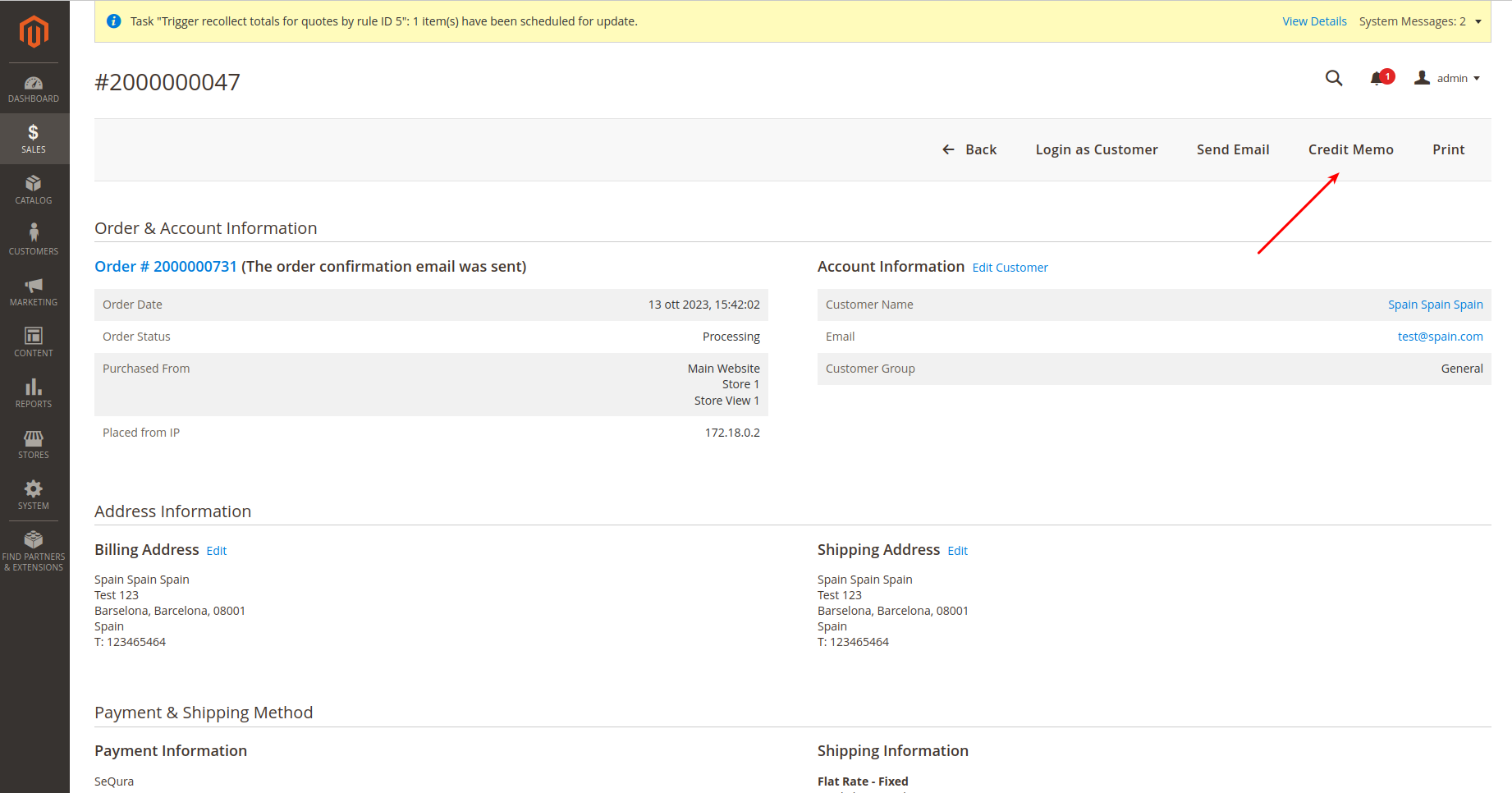 To refund an order placed with the seQura payment method, merchants should open an invoice for the created order and create a Credit Memo.