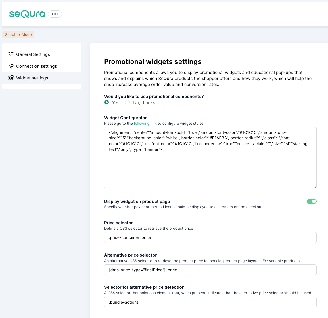 Display widget on product page: Activate our widget on the product page. Price selector: CSS selector to retrieve the product price. Alternative price selector: CSS selector to retrieve prices for variable products. Alternative price detection: CSS selector for cases where we want to select an alternative price for the product. **Default widget location selector: **CSS selector of the location below which our widget will be added. Customize widgets: Allows you to choose a different location selector and styles from the default ones for one or more of the enabled seQura products. |