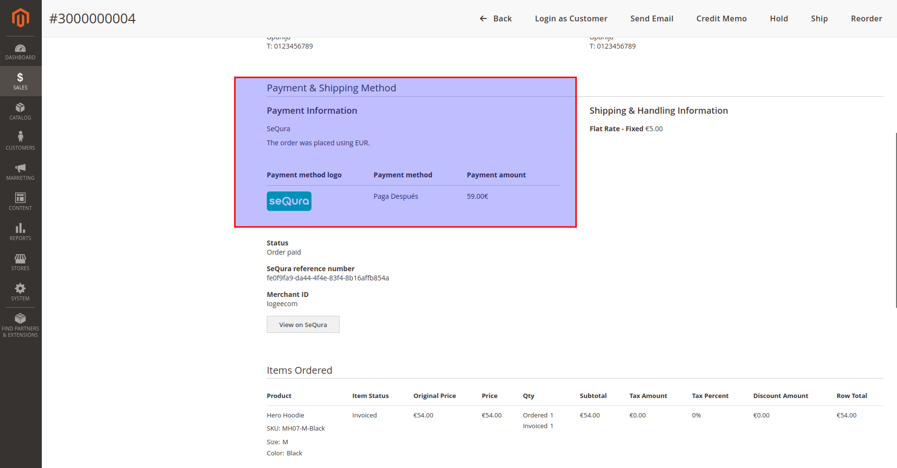 Merchant is able to view seQura payment information - the order reference and the link to seQura order on the Order overview page.