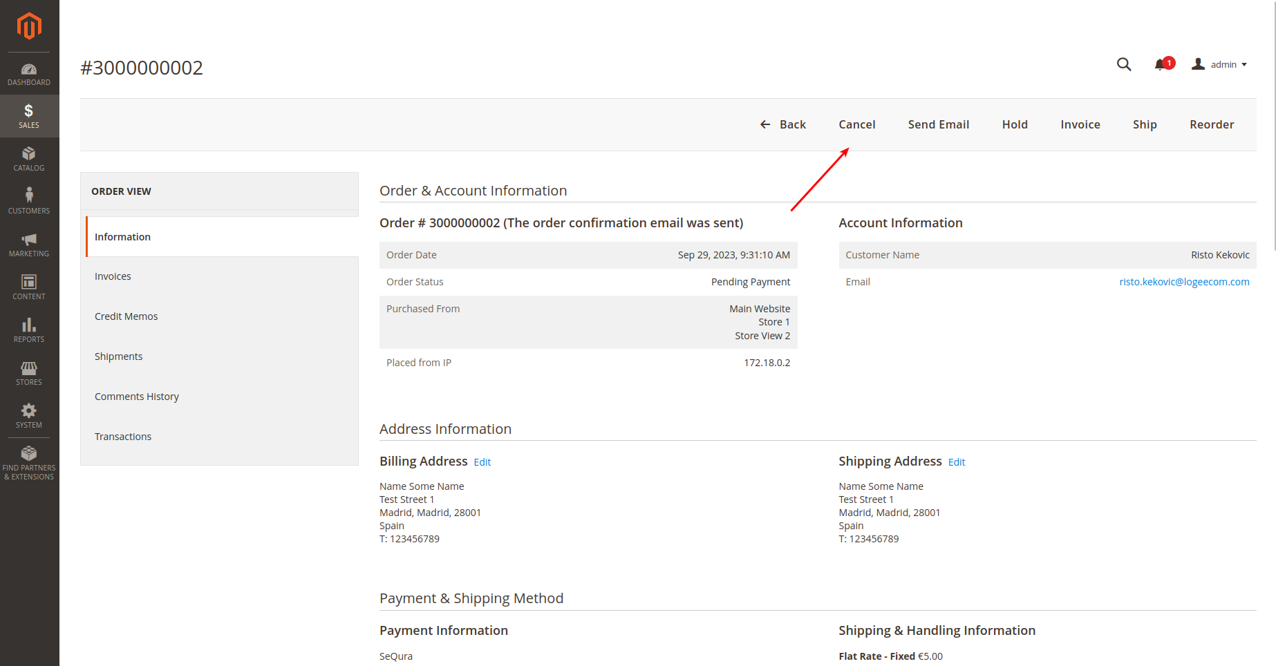 Merchants can cancel an order made with seQura payment methods using the native Magento 2 mechanism for cancelling an order. Magento 2 only allows merchants to cancel an order that has not yet been paid and shipped.