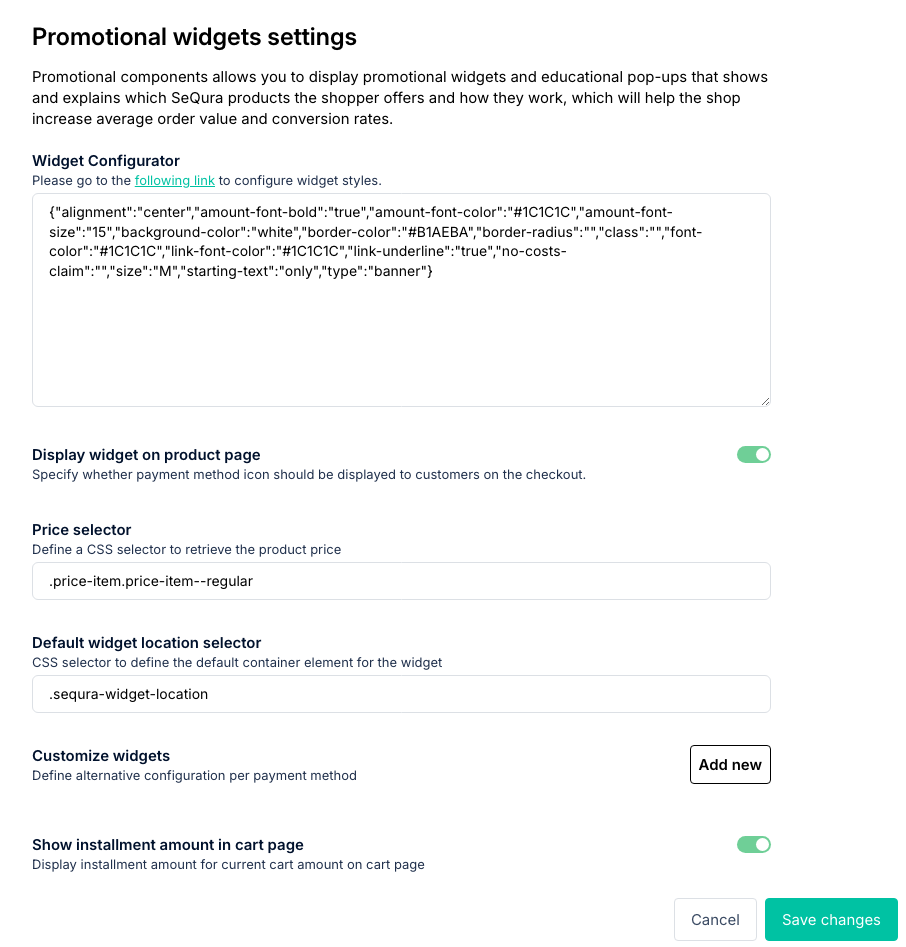 You have the option of customizing the look and feel of seQura promotional widgets using the widget configurator and then you can just copy the generated JSON configuration into the designated field in the widget configuration page.