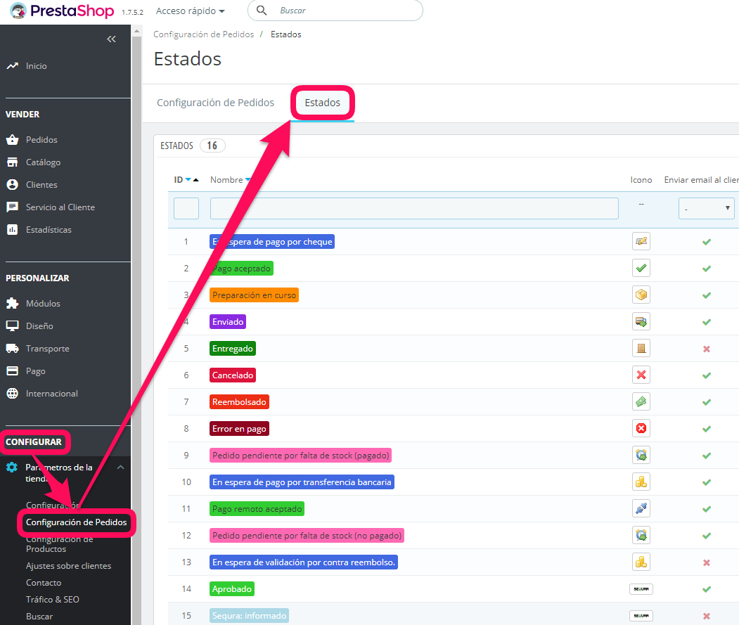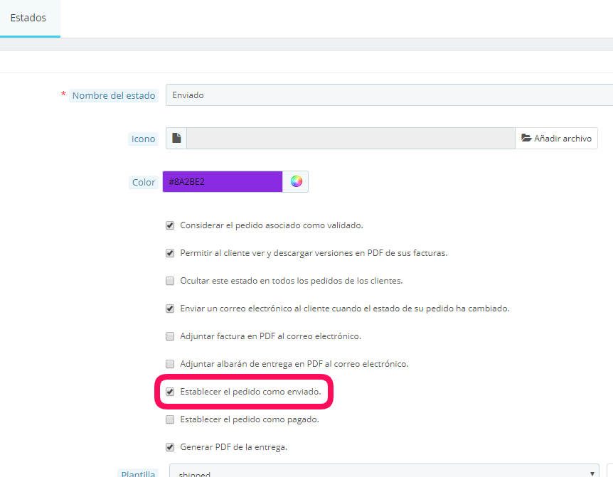 Go to Configuration → Orders configuration → States in the lateral menu. Click on the state used to mark a order as shipped (for example “Shipped”).