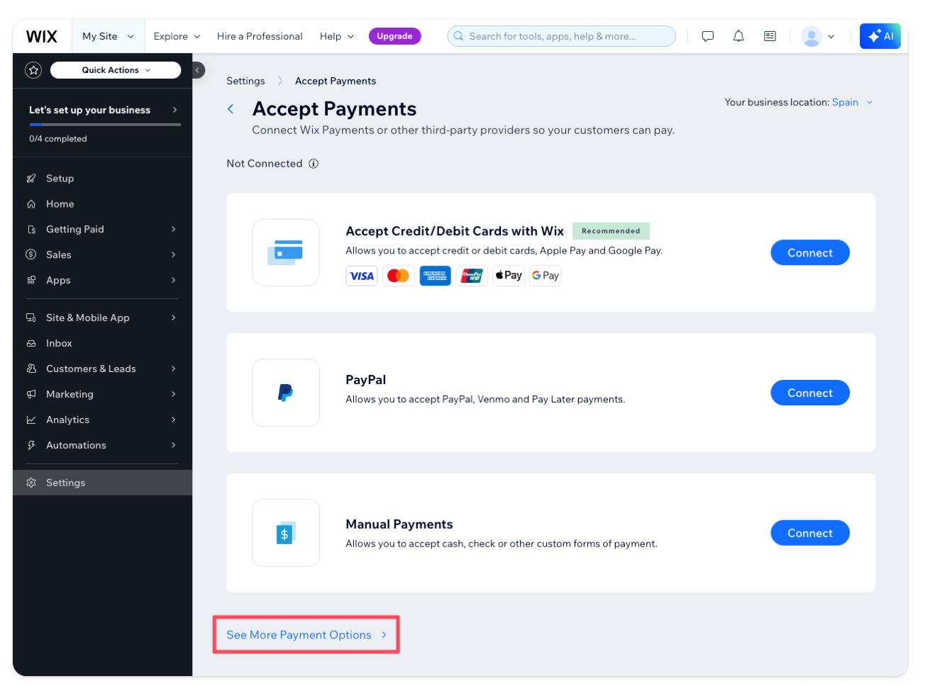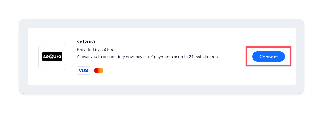 By navigating to the payment methods through the settings of the Wix admin panel, there will be the seQura payment method available for connection.