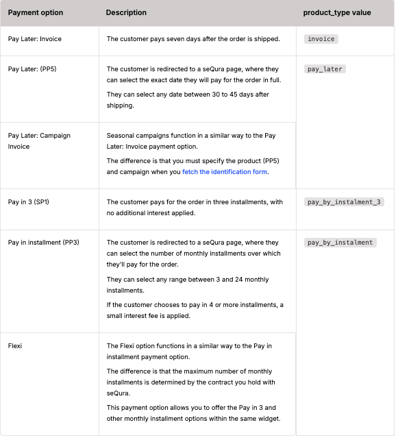 Each option must be provided as a separate checkout button linked to a unique payment request with its own processing.product_type value.