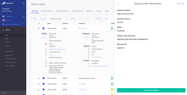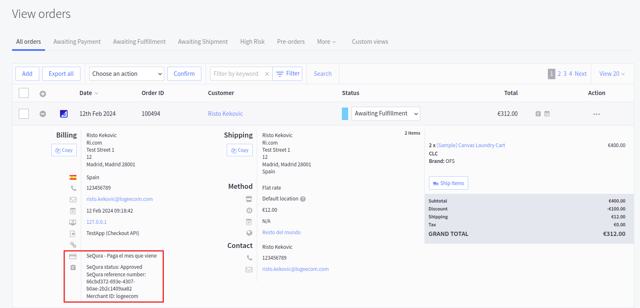 After someone places an order with one of SeQura payment methods, you will be able to view SeQura payment information for that order on the Order overview page. There are additional information about that order on the SeQura platform when you expand a specific order on the order overview page.
