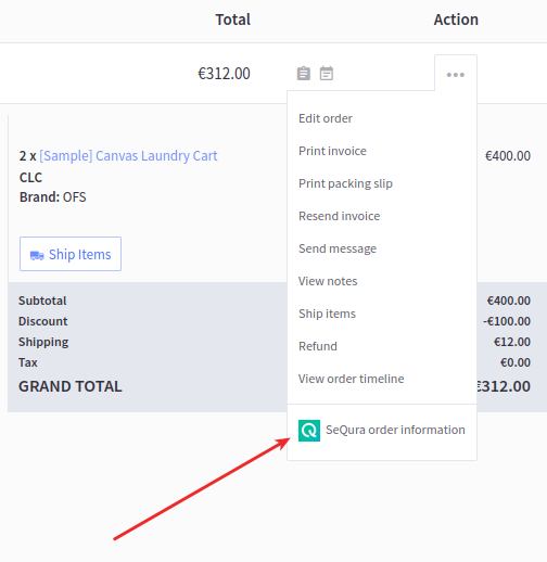 Additionally, in the actions menu you will also find an additional menu item for SeQura order information.