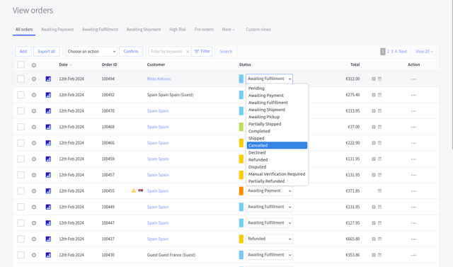 You are able to cancel an order made with SeQura payment methods using the native BigCommerce mechanism for canceling an order. Simply choose an order on the order overview page and change its status to Cancelled.