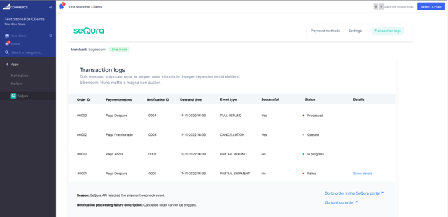 Since BigCommerce does not allow external payment processors to reject some order update action, and instead just informs those external processors of noteworthy events, if for any reason SeQura rejects a particular order update event, you will be able to see those incidents with descriptions and actions which allow you to see that order both in BigCommerce and in SeQura.