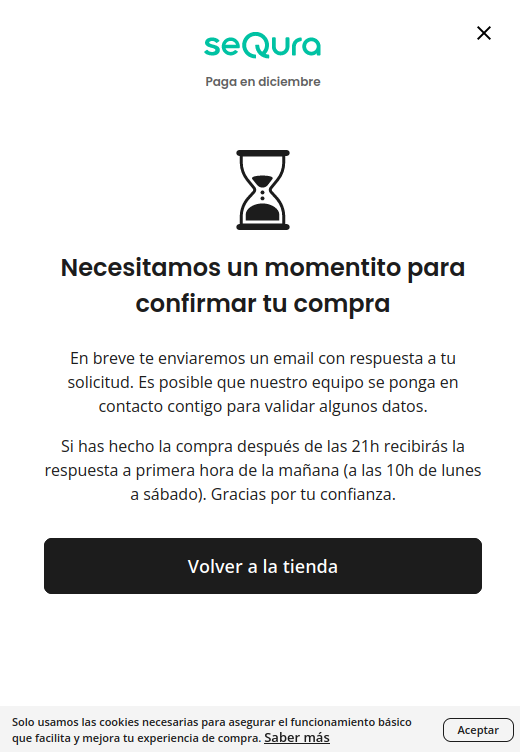 If a payment needs to be reviewed by SeQura before it can be processed and declared successful, as the last form view there will be a notification about payment revision, before redirecting to the thank you page.